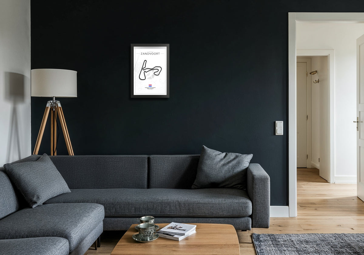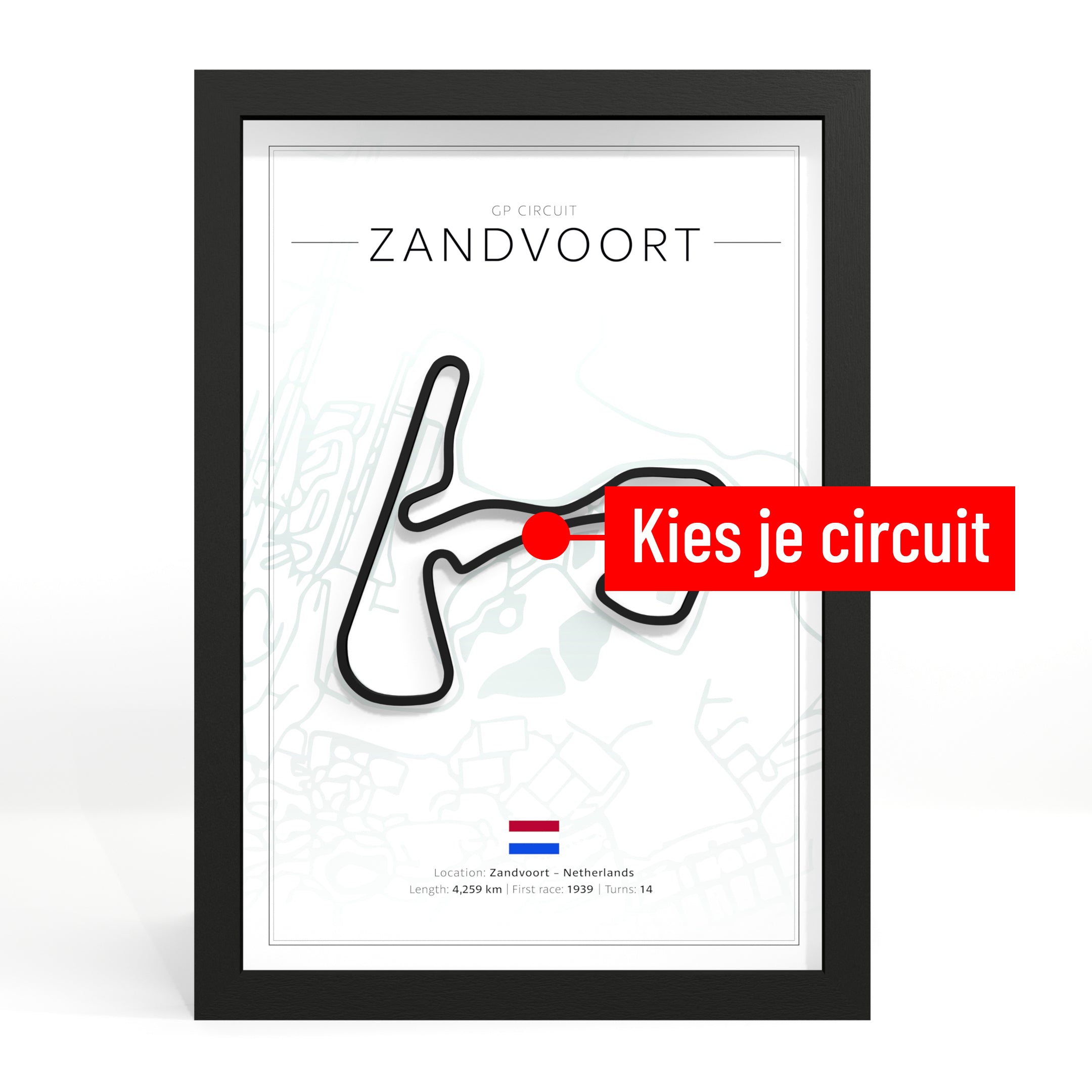 Het circuit is gedetailleerd 3D geprint en gemonteerd in een stevige houten lijst van 3 cm dik. De print is gemaakt op 250 grams ECOlabel mat papier, wat zorgt voor een rustige en hoogwaardige uitstraling. De lijst is geschikt om op te hangen of neer te zetten en past perfect in een woonkamer, kantoor of mancave.