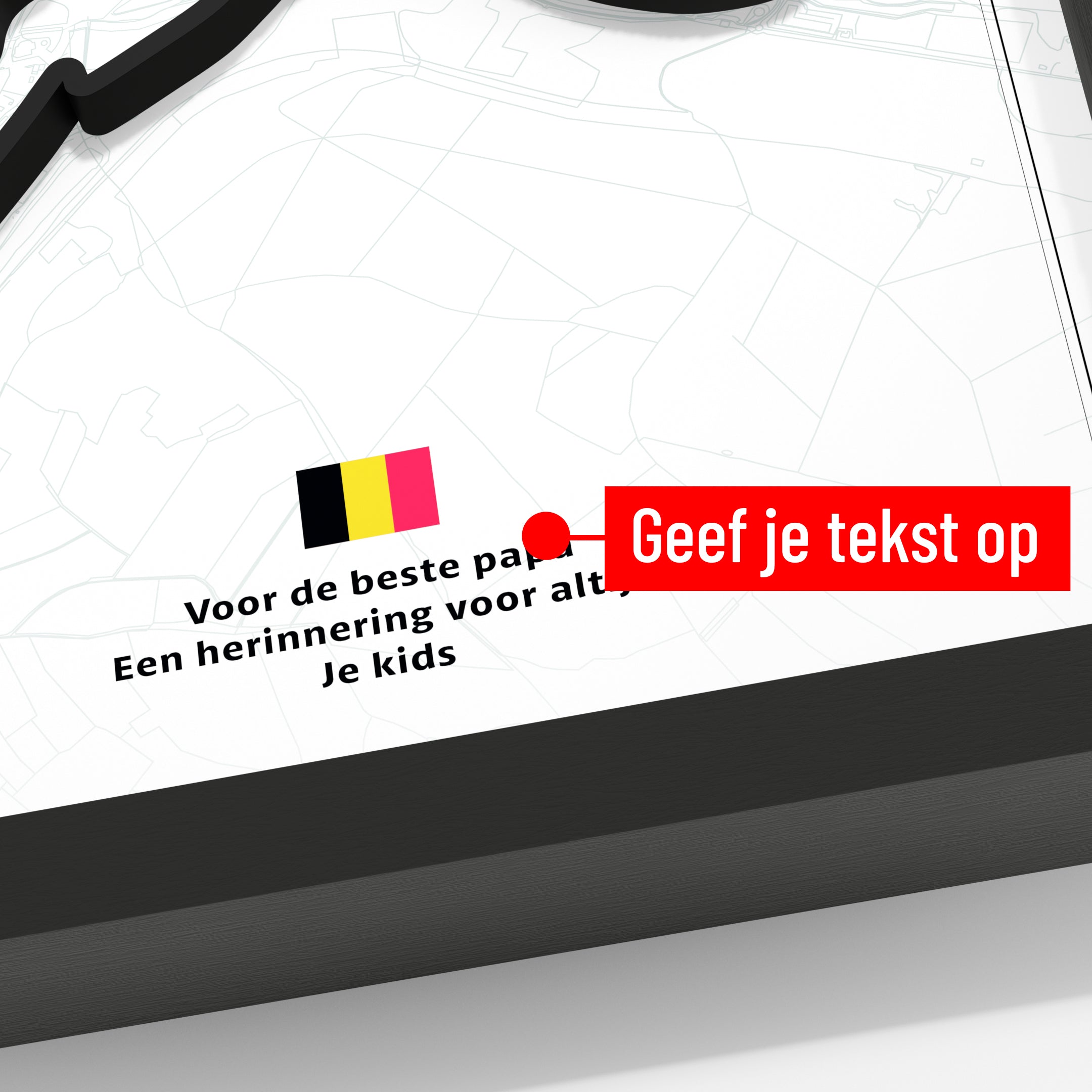 Bovenaan de lijst staat de naam van het gekozen circuit. Onderaan komt jouw persoonlijke tekst. Denk aan een datum, een ontmoeting, een eerste race samen of een korte boodschap met emotionele waarde. Zo wordt elk exemplaar een uniek aandenken dat meer zegt dan woorden.