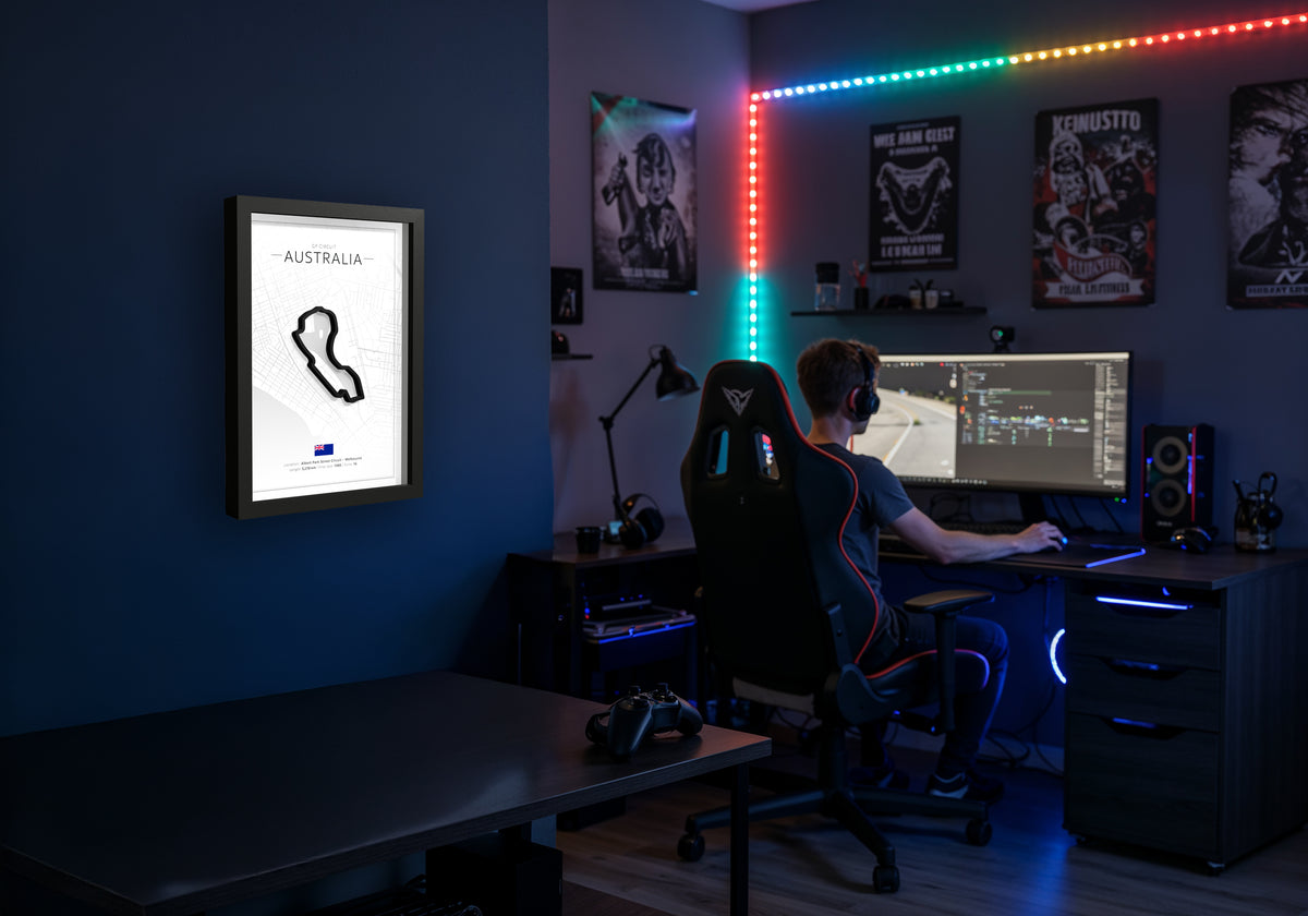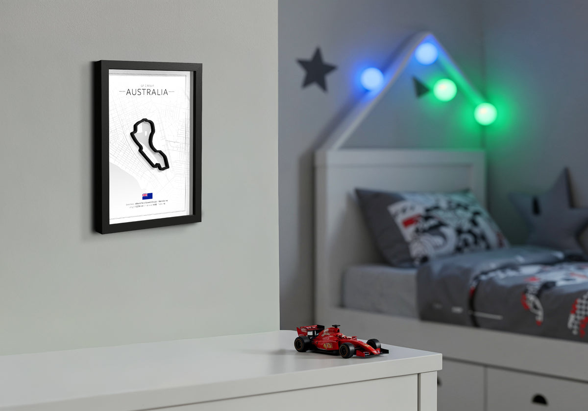 This 3D printed artwork shows the complete Australia circuit set in a deep black wooden frame. You can place it on a shelf or hang it on the wall thanks to the built in stand and hanger.