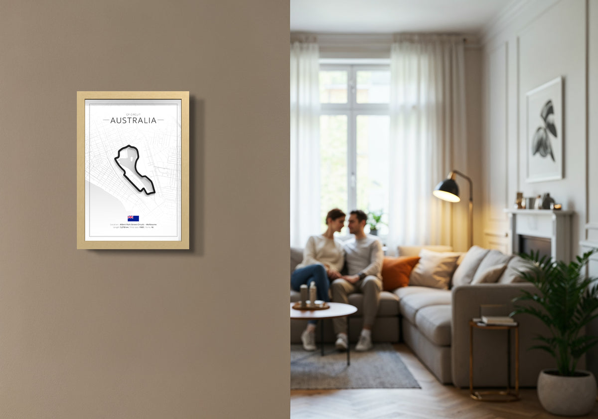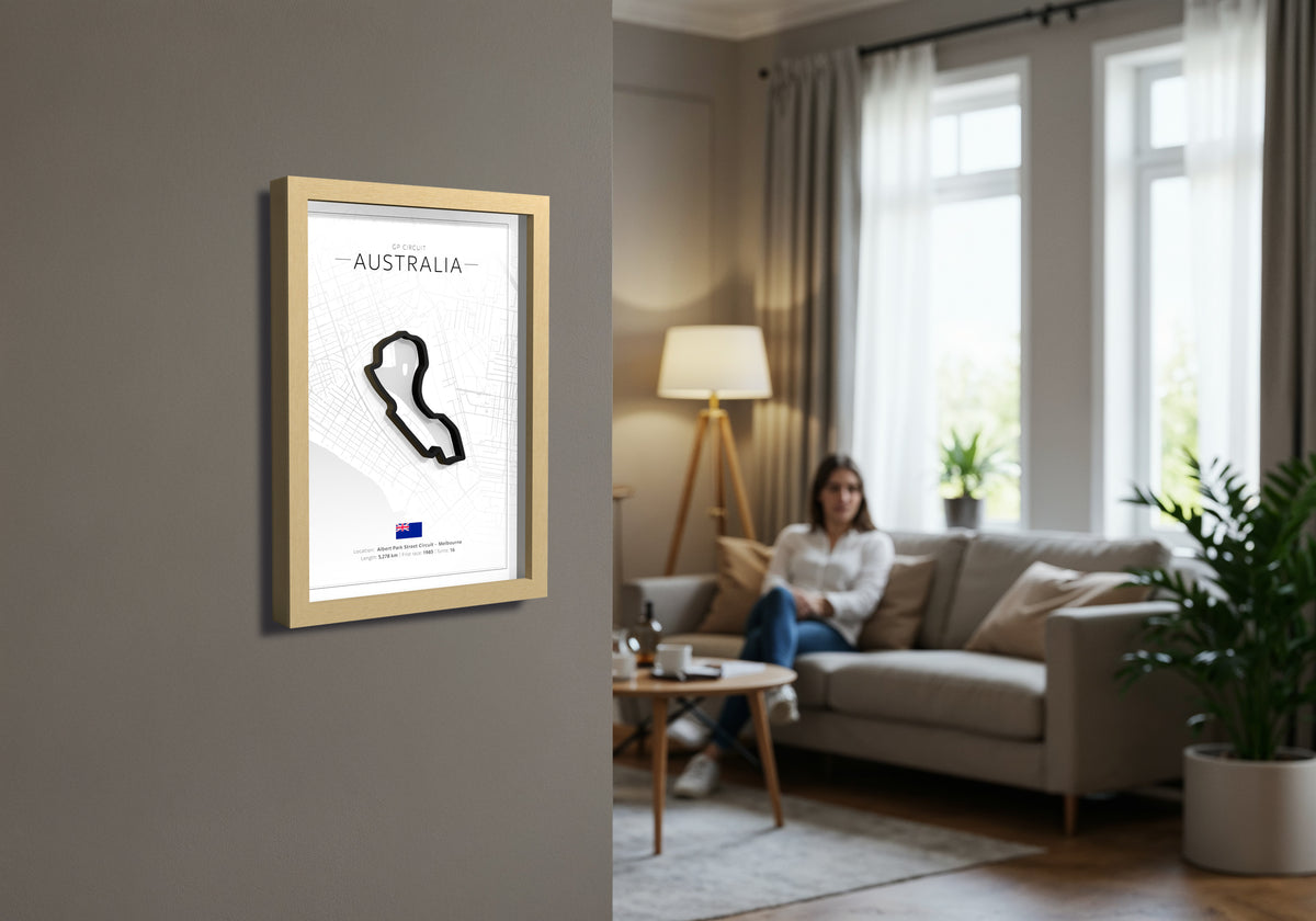Bring legendary race vibes into your home with this unique Australia circuit wall art in oak color frame