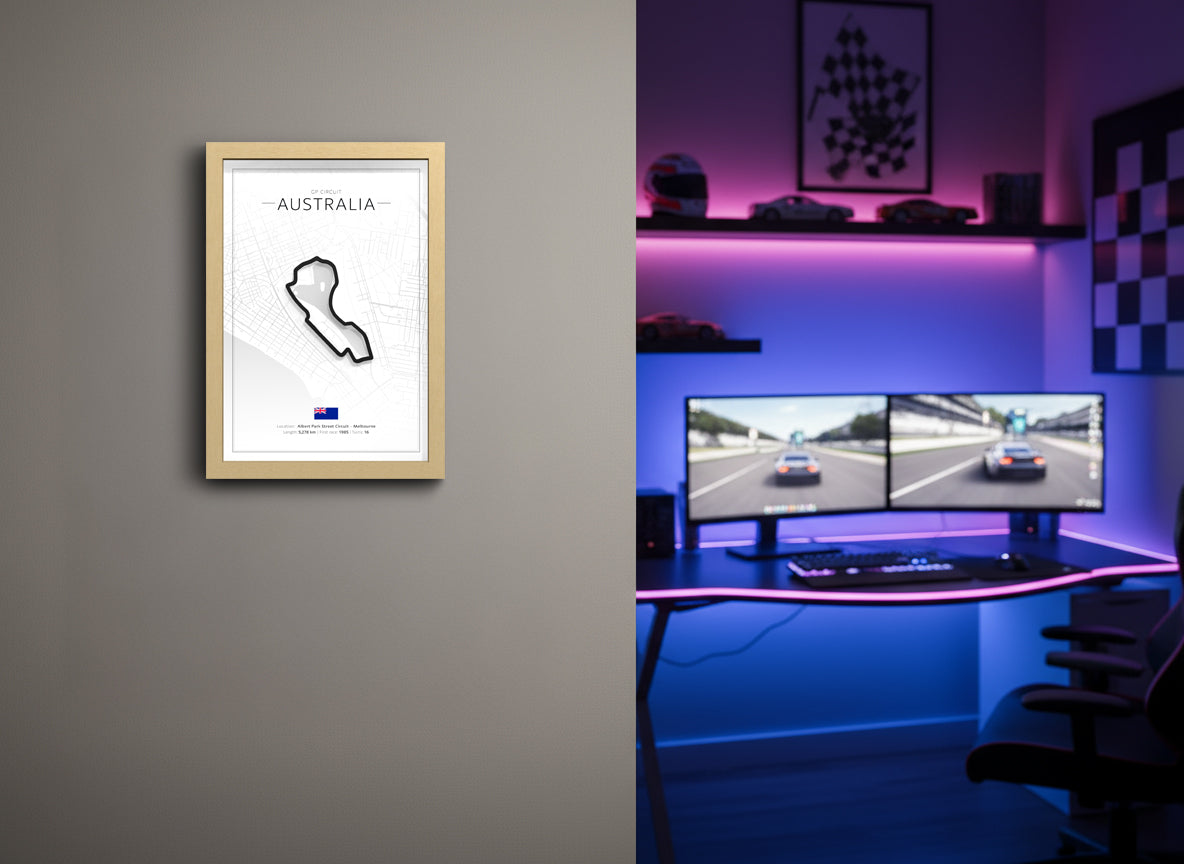This 3D printed artwork features the full Australia circuit presented in a deep oak color wooden frame. Thanks to the stand and wall mount you can display it anywhere easily.