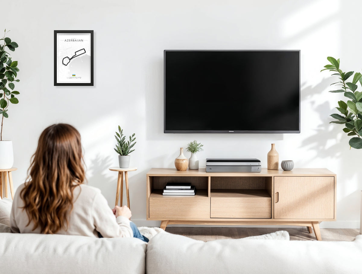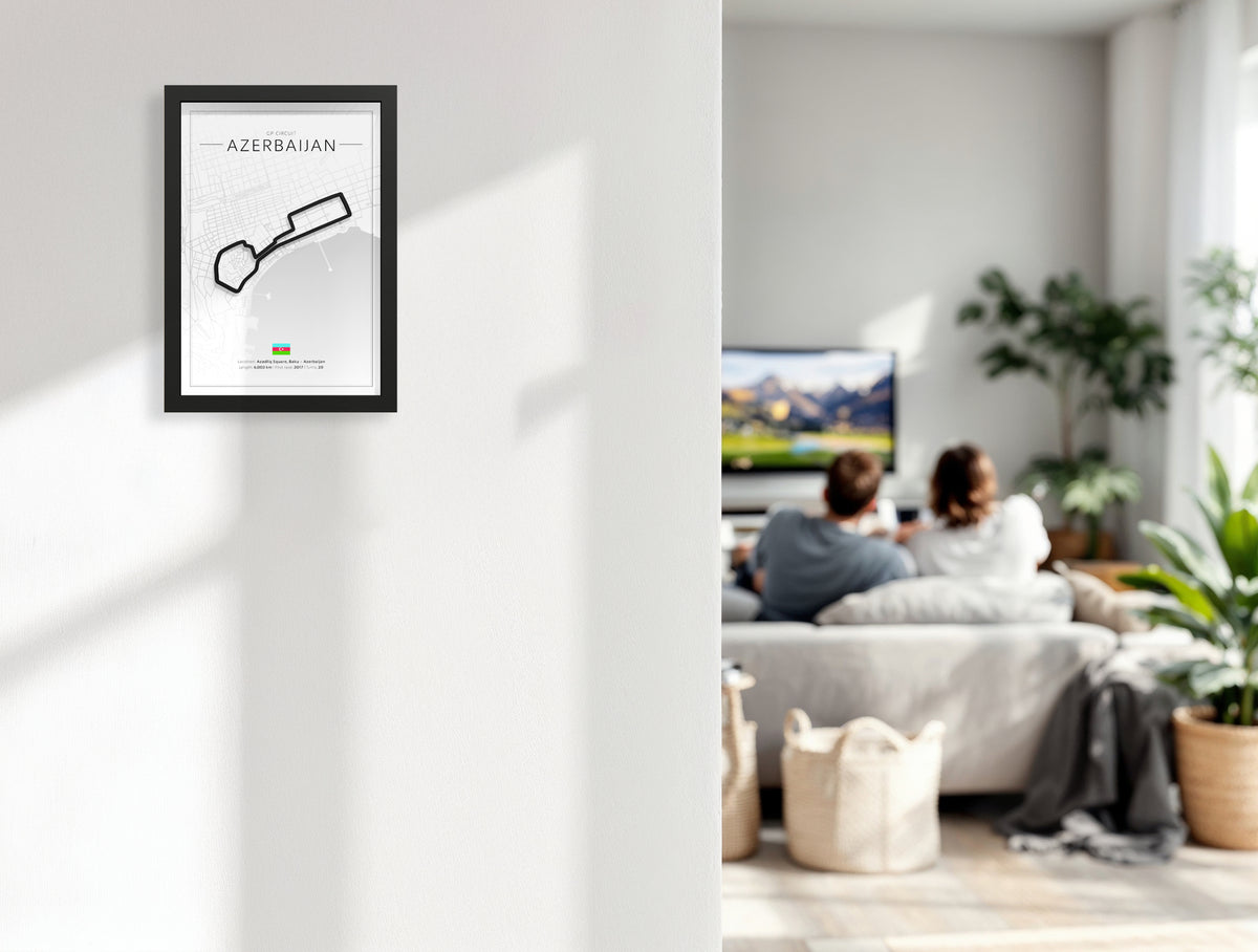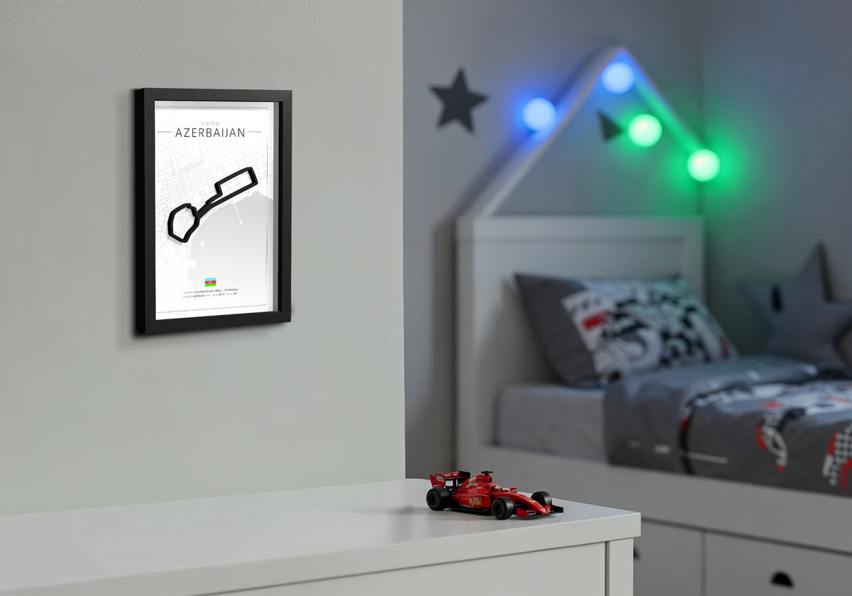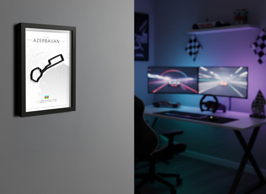 Looking for a unique gift for a motorsport lover or a striking piece for your own home? This 3D-printed design of the Baku City Circuit brings the adrenaline of street racing into any space. Framed in deep black wood, this piece has a bold, modern look.
