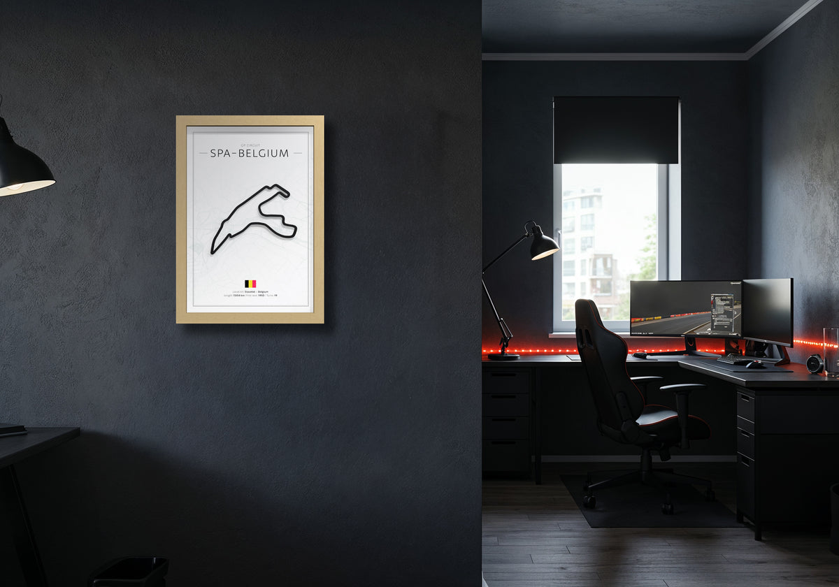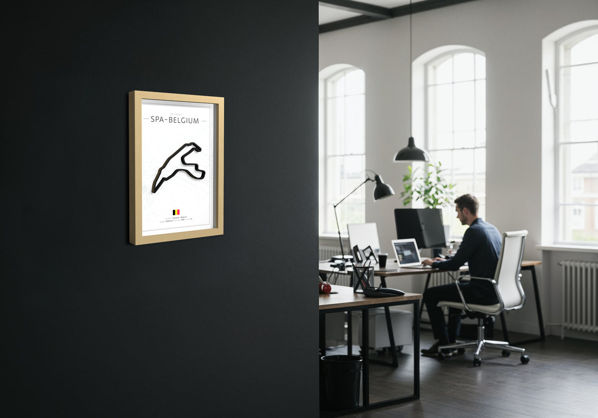 Every line of the track is carefully 3D printed and set in a warm oak-colored wooden frame, adding a natural yet sporty touch to your decor. Printed on 250g eco matte paper, the artwork subtly shows the circuit’s elevation and surrounding terrain.