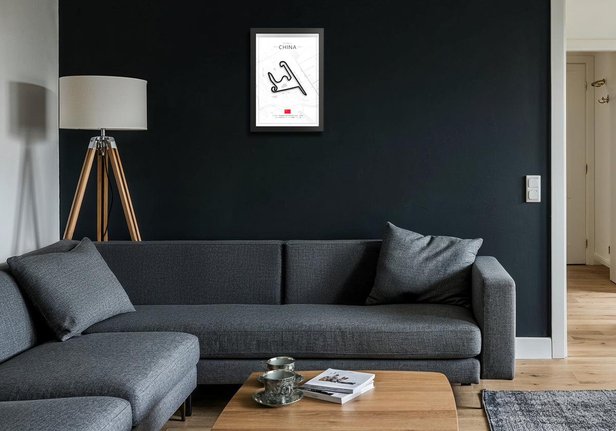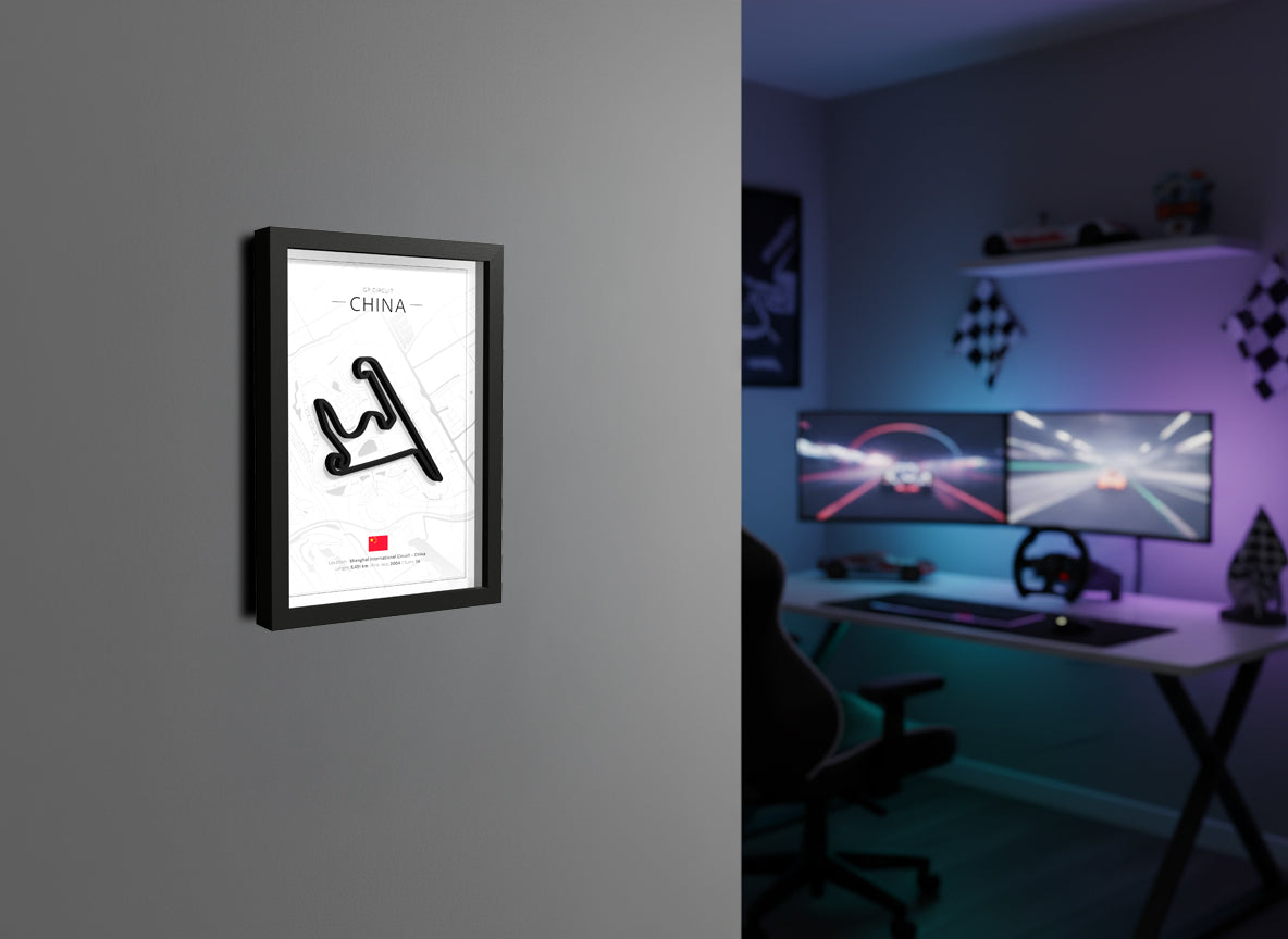Looking for a unique motorsport gift or a stylish piece to elevate your space? This detailed 3D artwork features the full China circuit, beautifully framed in a deep black wooden frame. With its clean lines and raised 3D effect, it captures the essence of racing while fitting seamlessly into any interior.