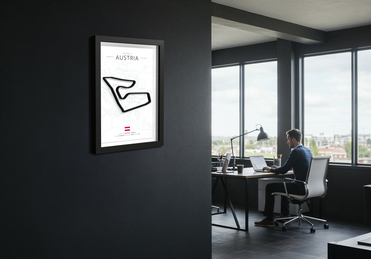 Located in the Styrian hills near Spielberg, this legendary track is known for its dramatic elevation changes and sweeping curves. The 4.318 km circuit features 10 turns, a fast uphill start, and breathtaking views — perfectly captured in this unique wall art.