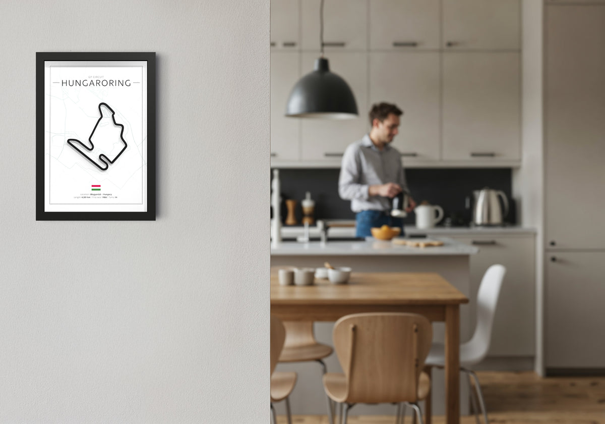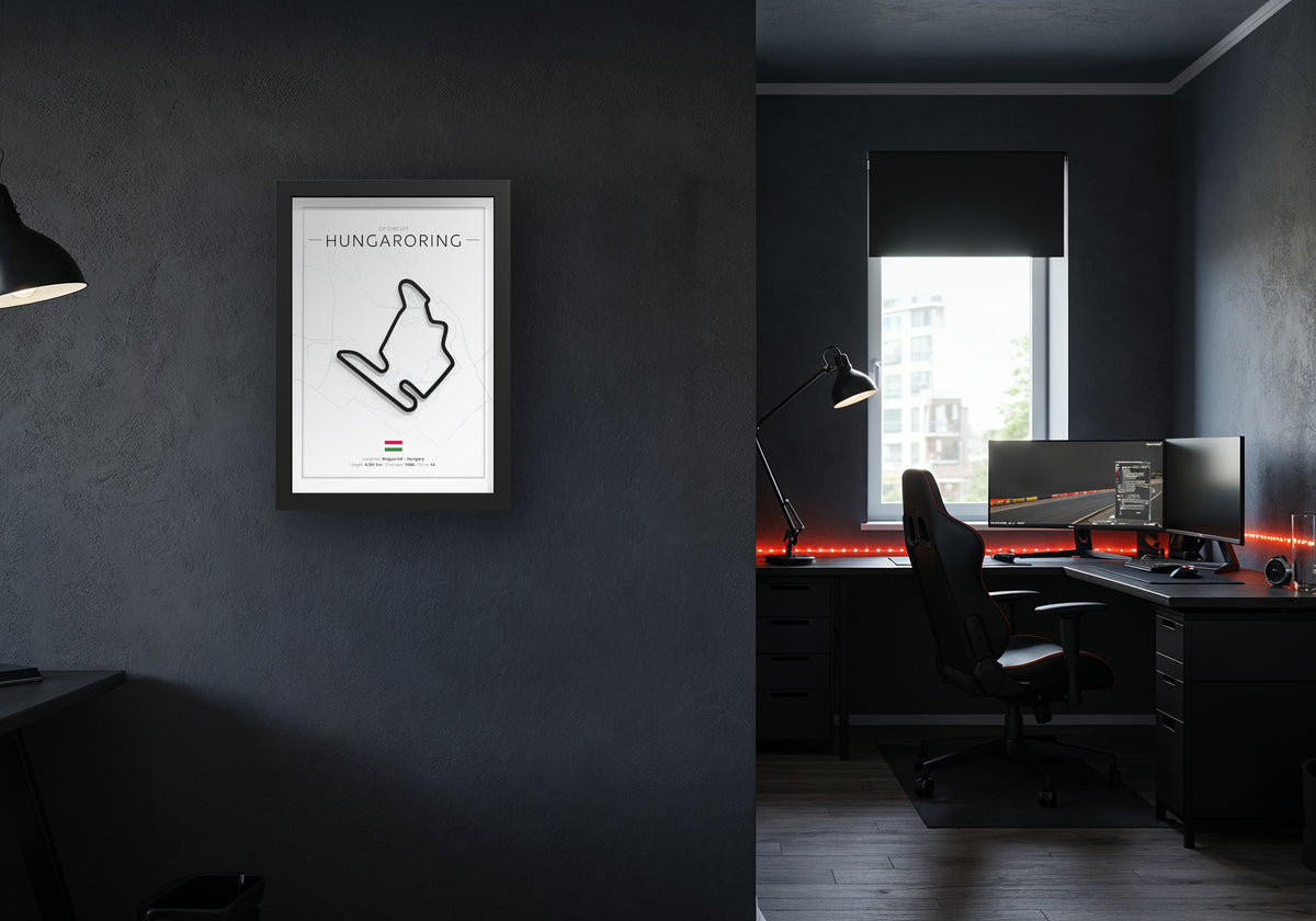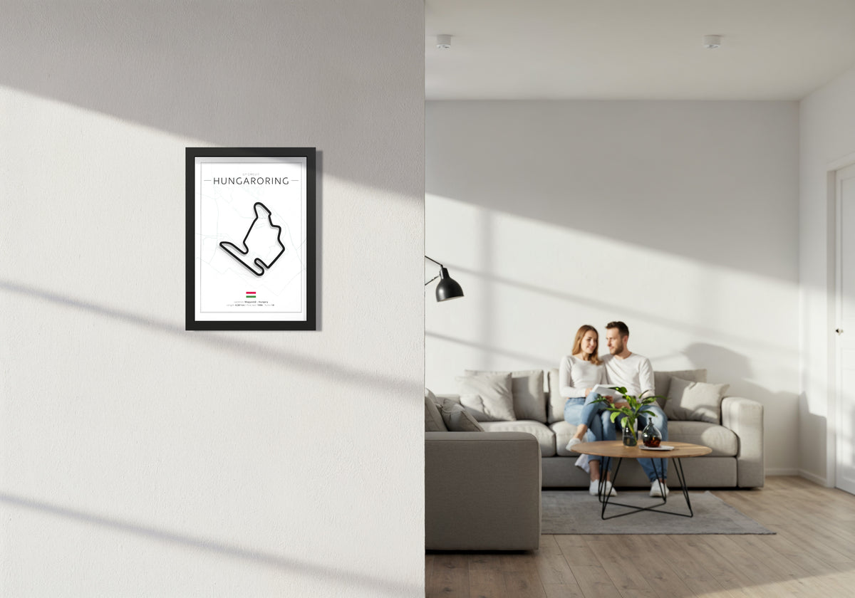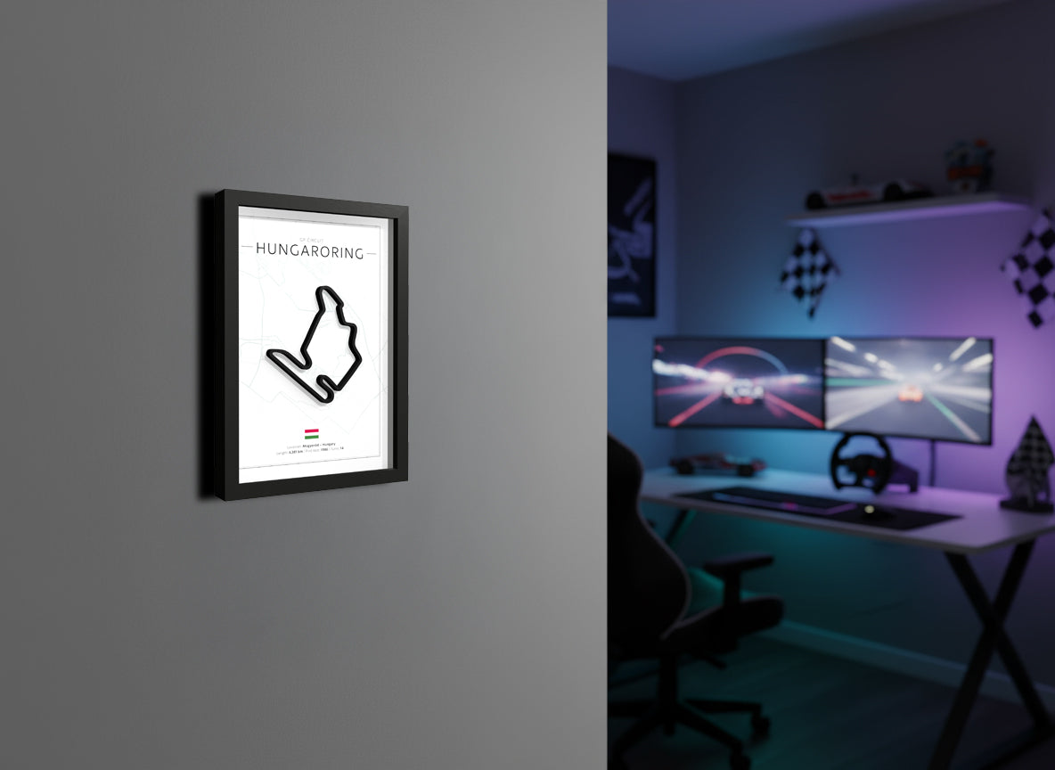 Hungary’s Hungaroring is known for its tight corners, technical layout and limited overtaking opportunities. This 3D printed artwork captures the full circuit with a warm oak colored frame for a refined motorsport look.